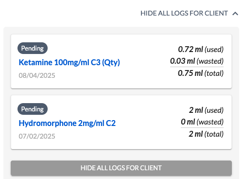 The View All Logs for Client feature has been updated to display the quantity used, quantity wasted, and the total (quantity used + quantity wasted).