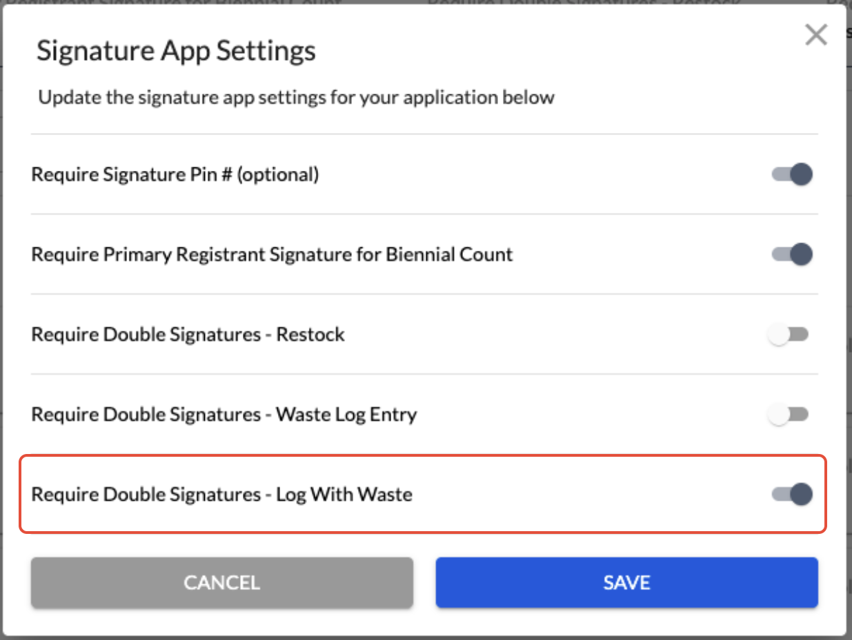 There is now an additional Signature App Settings option to Require Double Signatures - Log With Waste.