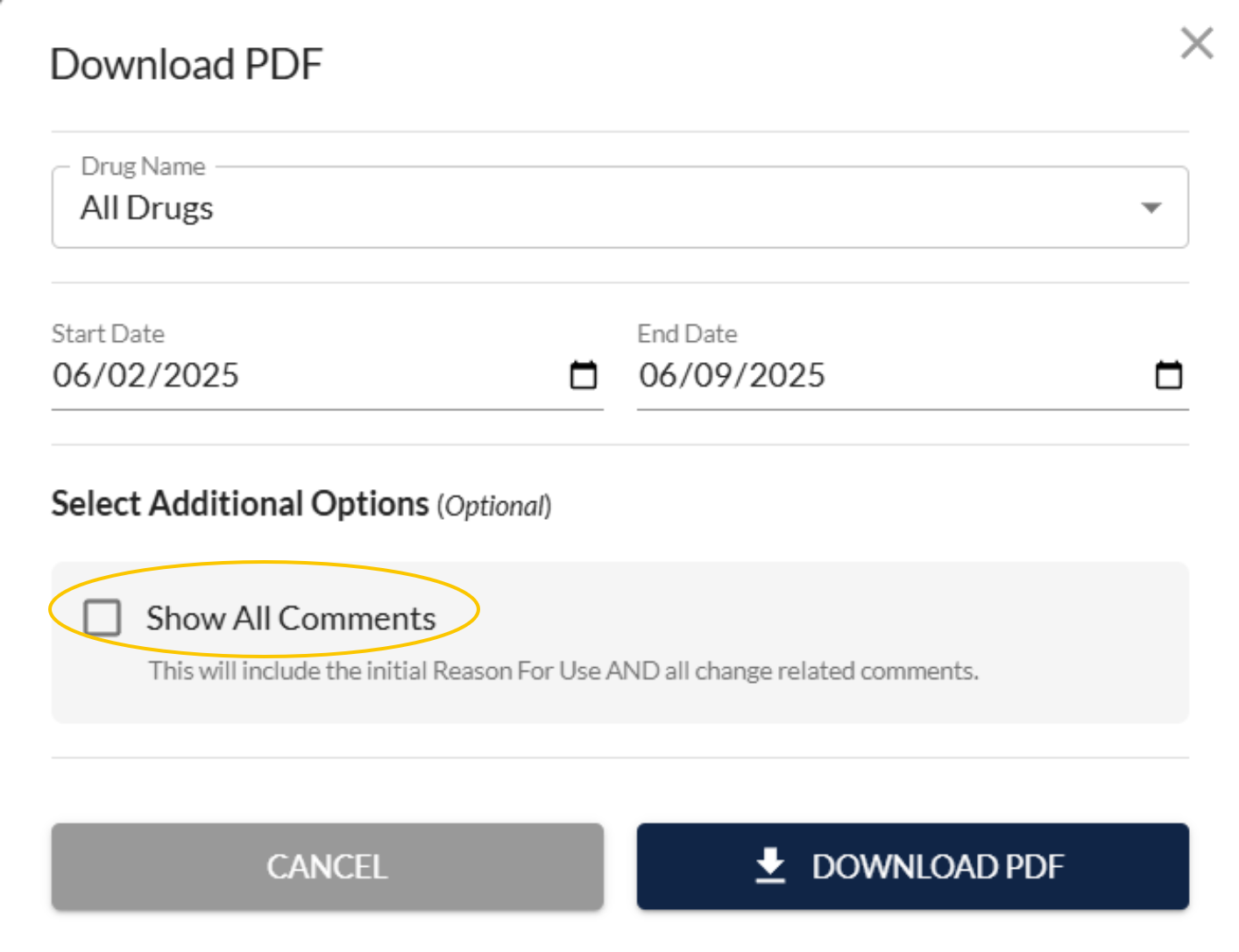 You can select All Drugs or a specific drug from the dropdown menu and click on Generate Report.