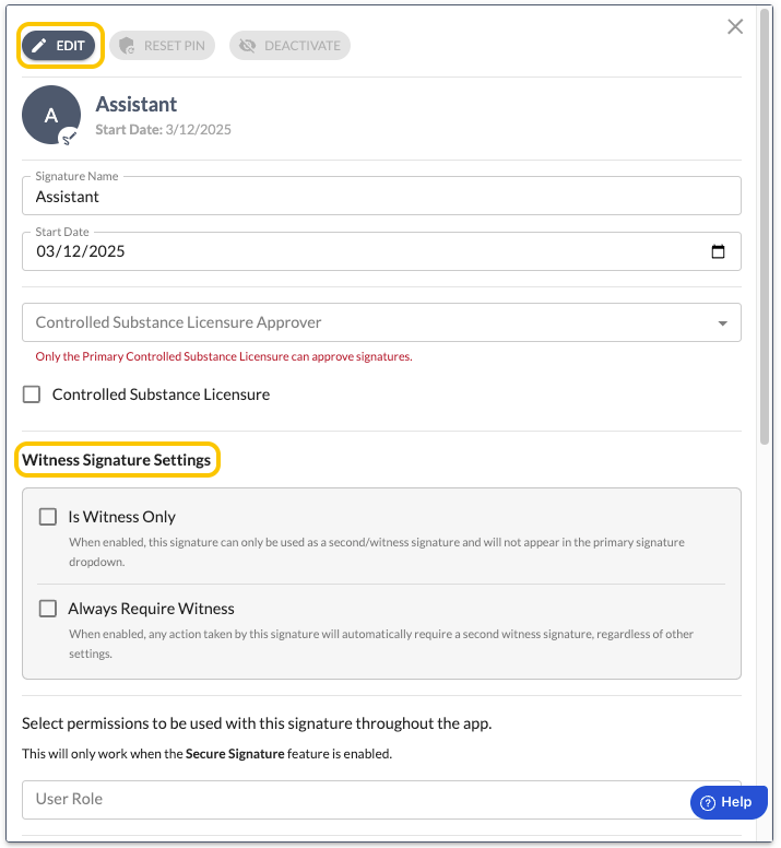 - Always Require Witness - Any action taken by the signature will require a second witness signature.